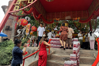 ปทุมธานี แม่ค้าออนไลน์ถวายสไลเดอร์และน้ำแดง 1,000 ขวด แก้บนกุมารทองเจ้าสัวเฮง