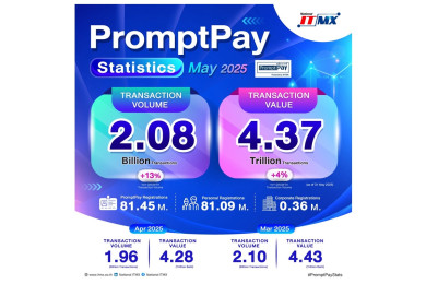 NITMX เผยสถิติการใช้งาน PromptPay เดือนพ.ค.68 ยอดธุรกรรมแตะ 2.08 พันล้านรายการ โตต่อเนื่อง 13% เมื่อเทียบปีต่อปี