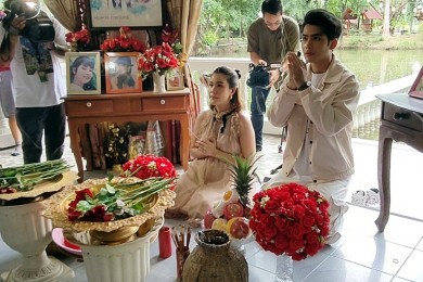 "เปา เปาวลี" อุ้มท้อง 6 ด. ควงคู่ "กานต์ ทศน" สักการะหุ่นแม่ผึ้งพุ่มพวง