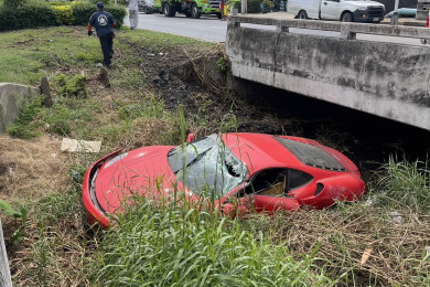 รถเฟอร์รารี่หลุดโค้ง ลงไปแช่อยู่ในคลอง คนขับบาดเจ็บเล็กน้อย