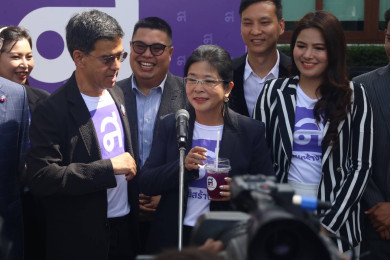 "สุดารัตน์" เปิดบ้านต้อนรับ "8 พรรคร่วมฯ" ชวนชิม "น้ำอัญชันมะนาว" ชี้น้ำแห่งประชาธิปไตย "ศิธา" โชว์เชือกรองเท้า ส้ม-แดง บอกต้องเดินไปด้วยกัน