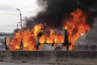 นาทีระทึก!! ไฟไหม้รถตู้วอดทั้งคัน บนถนน พระราม2