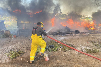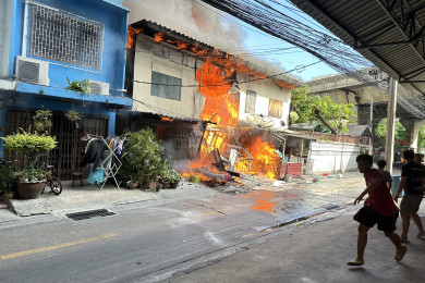 ระทึกเพลิงไหม้แคมป์พักคนงาน บริษัทประกอบกิจการเคลื่อนย้ายเครื่องจักร บ้านวอดเสียหายทั้งหมด 5 หลัง โกดังใหญ่ 1 หลัง