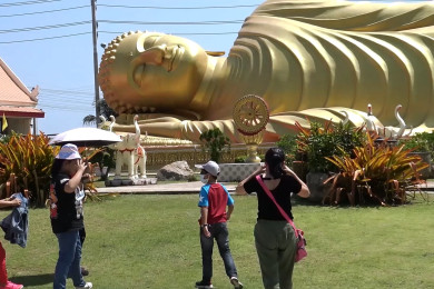 นักท่องเที่ยวชาวไทยและมาเลเซียแวะกราบไหว้พระนอนปางปรินิพพานองค์ใหญ่ที่สุดในประเทศไทย