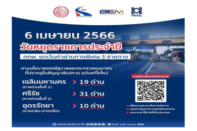 ขึ้นฟรีพรุ่งนี้(6 เม.ย.) กทพ.ยกเว้นค่าผ่านทางพิเศษ 3 สายทาง เนื่องในวันจักรี