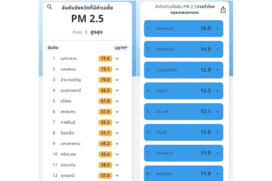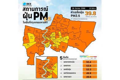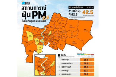 ให้สวมแมสก์ งดกิจกรรมกลางแจ้ง! ค่าฝุ่น PM 2.5 กทม. สูงขึ้น แดง 5 พื้นที่ ส้ม 65 พื้นที่ มีผลกระทบต่อสุขภาพ