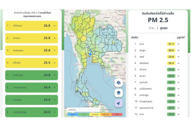 เช้านี้ กทม. 4 เขต มีค่าฝุ่น PM 2.5 ในระดับสีเหลือง อีก 46 เขตที่มีอากาศดีสีเขียว