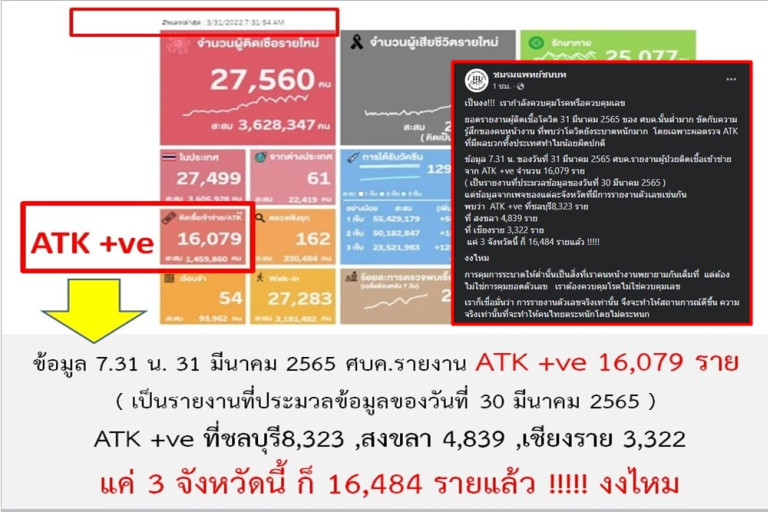 ข้อมูล 7.31 น. ของวันที่ 31 มีนาคม 2565 ศบค.รายงานผู้ป่วยติดเชื้อเข้าช่ายจาก ATK +ve จำนวน 16,079 ราย