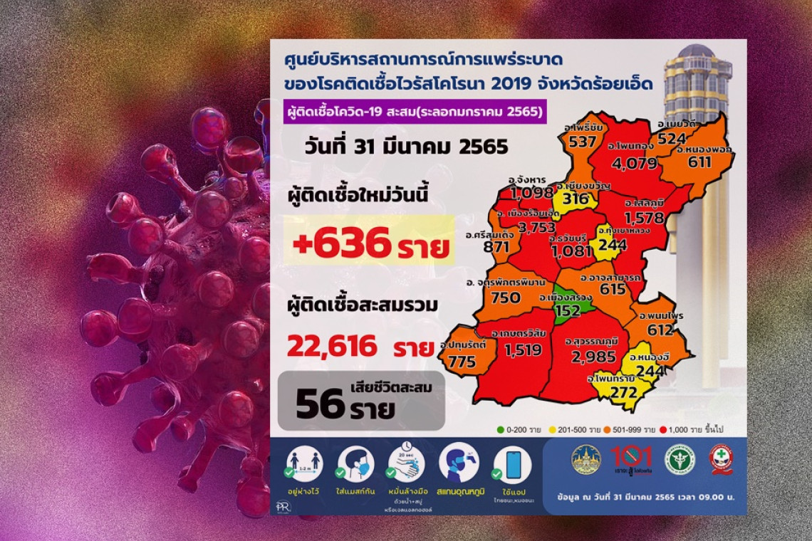 วันที่ 31 มีนาคม 2565 นายแพทย์ปิติ ทั้งไพศาล นพ.สสจ.ร้อยเอ็ด มอบหมายให้ จนท.รายงานสถานการณ์ไวรัสโคโรนา 2019 COVID-19 จังหวัดร้อยเอ็ด พบผู้ติดเชื้อรายใหม่ วันนี้ (ระลอก มกราคม 2565)ในทุกอำเภอจาก20อำเภอ 636 ราย ผู้ป่วยสะสม 22,616 รายรักษาหาย 552 ราย คงพยาบาล 4,936 ราย เสียชีวิต 1 ราย เสียชีวิตสะสม 56 ราย ยอดผู้ป่วยโควิด 19 ยืนยันสะสม ในจังหวัดร้อยเอ็ด ยอดสะสม 36,390 ราย เรือนจำ 1 ราย เสียชีวิตสะสม 174 ราย