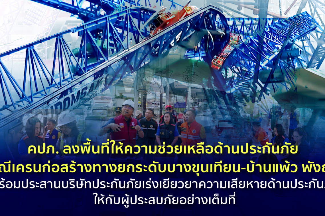 จากกรณีคานปูน (Segment) และเครน (Launching Gantry Crane) ซึ่งเป็นชิ้นส่วนและอุปกรณ์ที่ใช้ก่อสร้างทางยกระดับ โครงการก่อสร้างทางหลวงพิเศษหมายเลข 82 สายทางยกระดับบางขุนเทียน-บ้านแพ้ว ช่วงเอกชัย-บ้านแพ้ว ตอน 1 หมู่ที่ 2 ตำบลคอกกระบือ อำเภอเมือง จังหวัดสมุทรสาคร ได้พังถล่มลงมาระหว่างการก่อสร้าง ส่งผลทำให้มีผู้เสียชีวิต 6 ราย และบาดเจ็บ 9 คน เหตุเกิดเมื่อวันที่ 29 พฤศจิกายน 2567 นั้น เบื้องต้นสายส่งเสริมและประกันภัยภูมิภาค สำนักงาน คปภ. ภาค 7 (นครปฐม) และสำนักงาน คปภ. จังหวัดสมุทรสาคร ในฐานะพื้นที่เกิดเหตุเร่งบูรณาการร่วมกับหน่วยงานที่เกี่ยวข้องเพื่อตรวจสอบการทำประกันภัยและติดตามรายงานความเสียหายอย่างเร่งด่วนผ่าน Platform การรายงานข้อมูลกรณีอุบัติภัยกลุ่มหรือรายใหญ่ด้วยระบบอิเล็กทรอนิกส์ รวมทั้งลงพื้นที่เพื่ออำนวยความสะดวกด้านประกันภัยให้กับผู้ประสบภัยและครอบครัว เพื่อนำระบบประกันภัยช่วยบรรเทาความเดือดร้อนให้กับครอบครัวของผู้เสียชีวิตและผู้บาดเจ็บได้อย่างมีประสิทธิภาพและเป็นธรรม